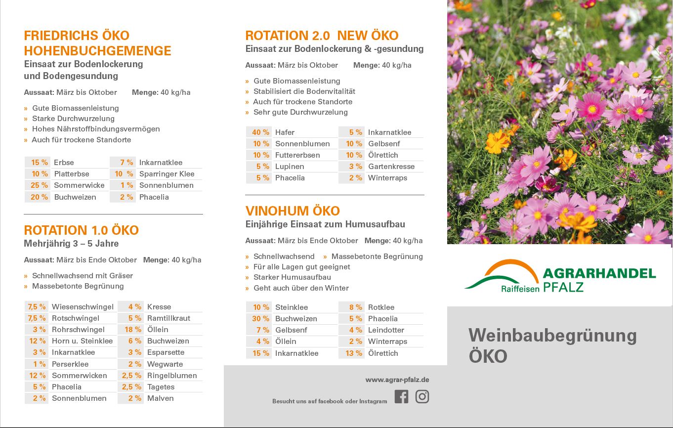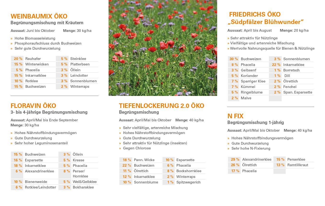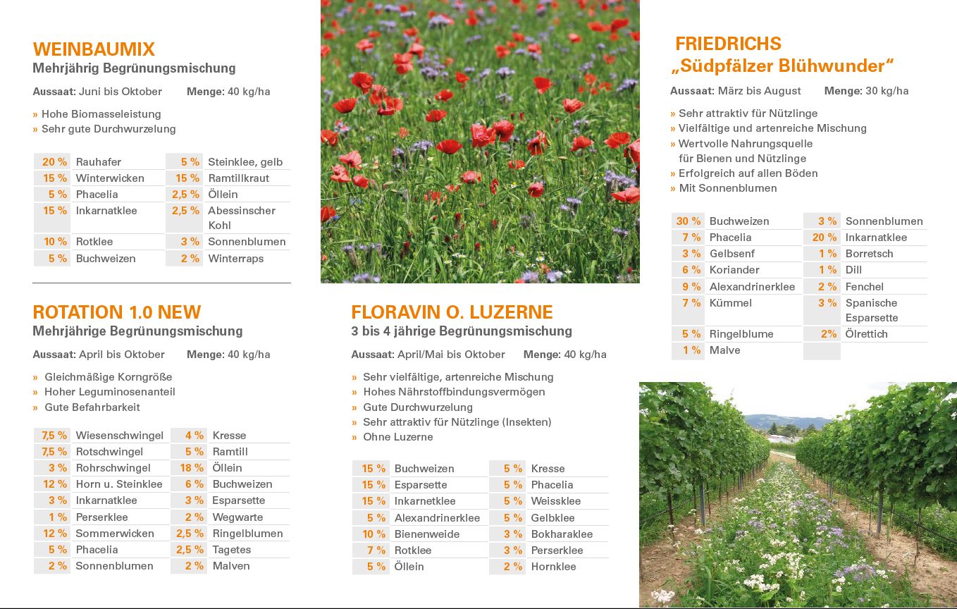 Eigens für den Weinbau abgestimmte Mischungen. Speziell zur Verbesserung der Bodenfruchtbarkeit und zur gezielten Förderung einer großen Artenvielfalt in den Anlagen.
